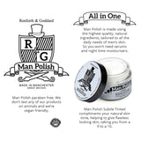 I use man polish for a few good reasons , great packaging and man styled jar ….quick and easy to apply after shaving and is absorbed quickly and leaves an even glow …. Maintains healthy skin as well as looks . Ex military and a wee but older now so years of heavy sun exposure means I have to be careful ….so for me it’s a win win product , looking cool without the rays !